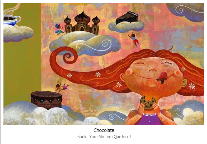 In this first illustration from ¡Yum!¡Mmm Qué Rico! America’s Sproutings you see a red-headed girl enjoying chocolate. There’s a chocolate castle and a cup of cocoa floating in the clouds. You see children literally diving into chocolate cake and pie. Surrealists like Rene Magritte explored putting unrelated objects together in such compelling ways. I like to make word lists and force connections between unrelated objects. For Book Fiesta! three kids and their dog [who thinks he is a pirate] are off on an adventure. Now they could be reading while sitting on a couch but a more playful idea is to put them in the mouth of a happily spouting whale. Sure you could do this in photoshop but it might be scary for kids. As an illustrator you can tell the story with visuals that send the right information to a child’s imagination. It’s all about having fun.